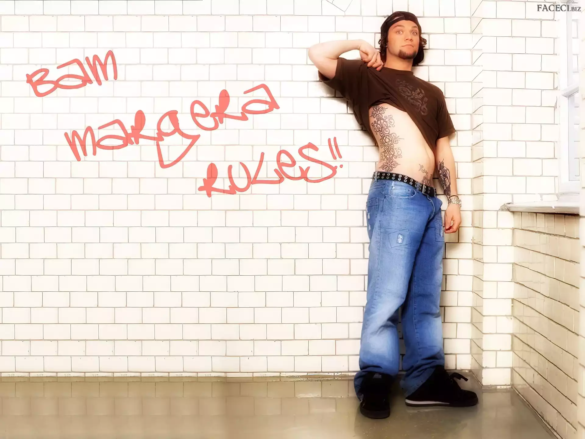 kurtka, Bam Margera, rozpięta okulary, Bam Margera, twarze t-shirt, Bam Margera, brązowy okulary, Bam Margera, butelka włosy, Bam Margera, ciemne zegarek, Bam Margera, deskorolka